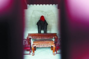 这座尚未完工的四合院风格祠堂,朱红色的围墙四周,花岗岩雕成的石栏环绕。院内东西厢房内分别摆设着整体浴缸和木质仿古雕木床。正房中摆放着一座3米高的铜像。