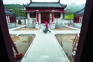 网帖称:正在修建中的祠堂完全是仿古四合院庙宇式的建筑陵区。 李德海母亲坐姿铜像。 祠堂中摆放的李德海母亲的铜像,上面蒙了一块红布。本报记者 王申 摄 昨日,一名施工人员穿过祠堂。近日,山东烟台市人大常委会原常委李德海被指毁林建豪华墓和祠堂。本报记者 王申 摄