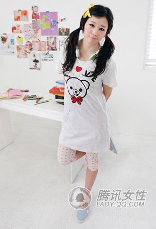 主题二:卡通图案 让心更年轻 “宅”搭配:卡通小熊连衣裙式长Tee+粉蓝x粉红小圆点7分铅笔裤+粉蓝色布鞋+卡通项链