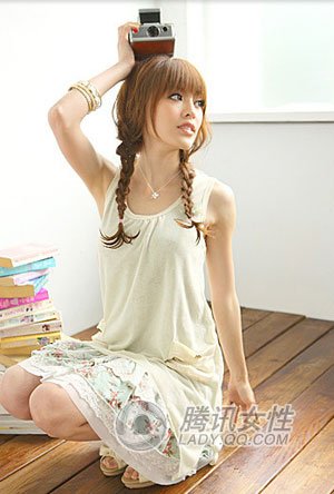 主题四:淑女风情 在家也浪漫 “宅”搭配:米色雪纺绸背心+蕾丝边小碎花短裙+蝴蝶结小鱼口楔形鞋
