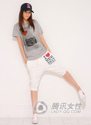 “宅”搭配:灰色印花Tee+白色7分运动裤+白色休闲球鞋