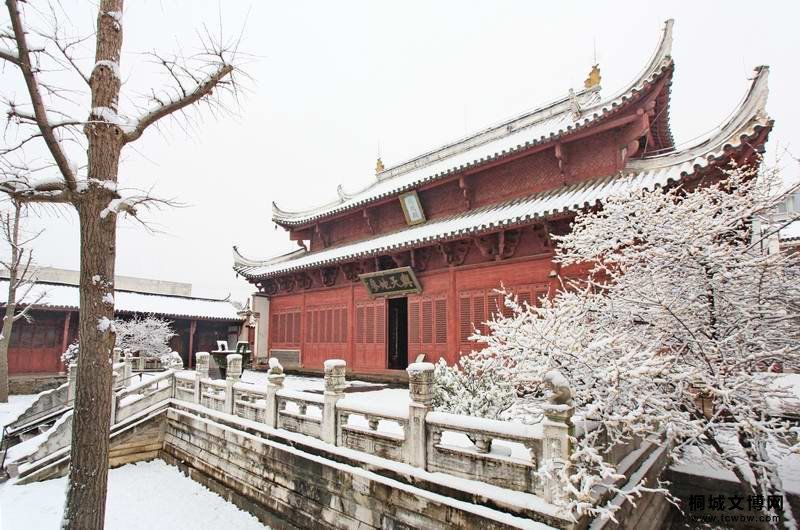 最近一次复修后的文庙广不及旧制,却也精致典雅。整组建筑以南北成中轴线,对称布局。门楼、棂星门、泮池、泮桥及两边厢房为前院,大成门、东西庑、月台、大成殿为后院。重修后的文庙门楼浑朴高逸,为三开间亭阁式建筑,两侧为嵌有“宫墙万仞”石刻的红色宫墙,成为当今桐城最具文化韵致的地标性建筑。与文庙大门相辉映的棂星门,为汉白玉石建筑,四柱三开间冲天石坊,庄严典雅。而泮池的发掘甃理,使文庙频添了几分悠远的文化意蕴,“思乐泮水,薄采其芹。”泮池,这一儒学的代称,七百年来曾有无数桐城士子簪芹“入泮”、通籍折桂。今日之泮池,有泮桥横卧。高风永夜,月映泮池,设若登上泮桥,仰观大成殿端凝圣洁,耳闻其四端风铎和鸣,仿佛玉振金声,游目骋怀,定会让人悠然而忘机。