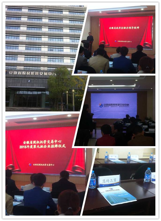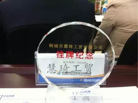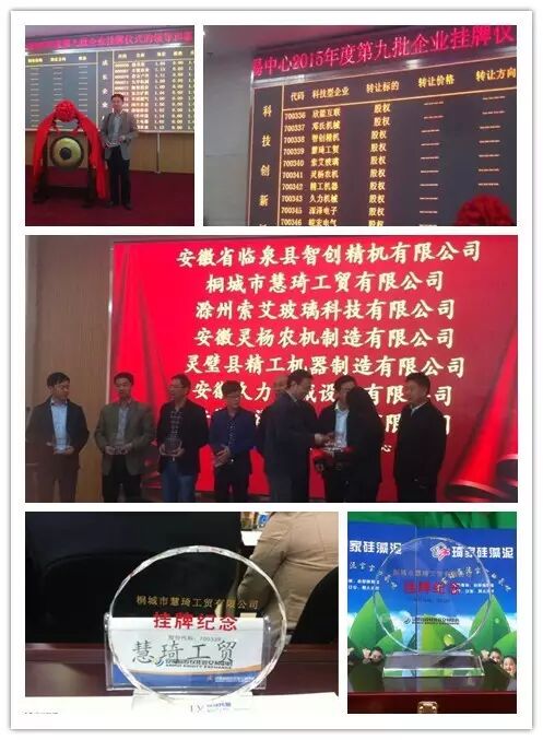 2015年10月30日,安徽省股权托管交易中心举行了2015年第九批企业挂牌仪式,来自马鞍山、蚌埠、桐城等地的企业登陆安徽省区域股权交易市场。期间,桐城市慧琦工贸荣获科技版挂牌企业称号,并授牌。