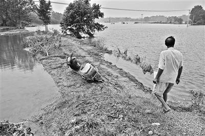 青城村被洪水围成孤岛,决口的堤坝上,一辆电动车陷在泥里摄影/本报记者 黄亮
