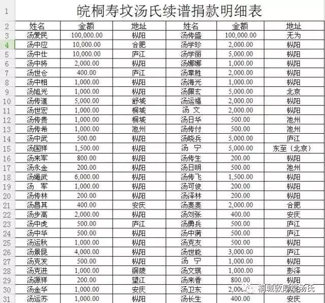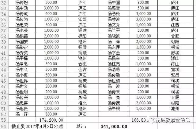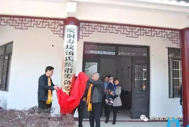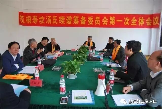 与会宗亲举手表决,一致通过《皖桐寿坟汤氏续谱筹备委员会》章程与组织架构及成员推举名单。 活动第三项:皖桐寿坟汤氏续谱筹备委员会会长汤中应向与会宗亲致辞。汤会长说:“非常感谢宗亲们的信任,推举我出任会长一职。小时候,我的母亲跟我说,汤中应,你要听家人的话,今天,印证了我母亲当年跟我说的话,我要听家人的话,替家人办事。”汤会长说,汤氏续谱要完善修谱组织、制订续谱方案、筹集续谱资金。续修族谱,是一项非常宏大的工程,需要全体族人同心协力、同舟共济。我们坚信,只要全体族人想法一致,团结相向,没有克服不了的困难,我们续谱的目标一定能够实现! 活动第四项:由汤中应会长、汤传信顾问为皖桐寿坟汤氏续谱筹备委员会揭牌。 活动第五项:与会全体宗亲合影留念。合影宗亲有本族永、可、用、昌、世、传、忠、厚、代等九代宗亲,从17世永字辈至25世代字辈宗亲,九世欢聚一堂,非常难得。 揭牌仪式结束后,皖桐寿坟汤氏续谱筹备委员会全体成员在筹备委员会办公室二楼召开第一次全体会议。与会委员就续谱工作献言献策、提出建议。 本次揭牌活动,得到了各地宗亲的大力支持,大家踊跃捐款,慷慨解囊,集腋成裘,捐资捐劳!会议当天共收到捐款341000元整。 皖桐寿坟汤氏续谱筹备委员会揭牌活动的成功举办,有力促进了宗族成员的沟通和向心力量,进一步继承和弘扬汤氏宗亲开成的优良传统,凝聚宗亲,使得每一位宗亲在宗谱续修工作中奉献自己的力量,为八修宗谱能够顺利完成奠定了基础!更为实现宗族繁荣启动了昌盛之光!